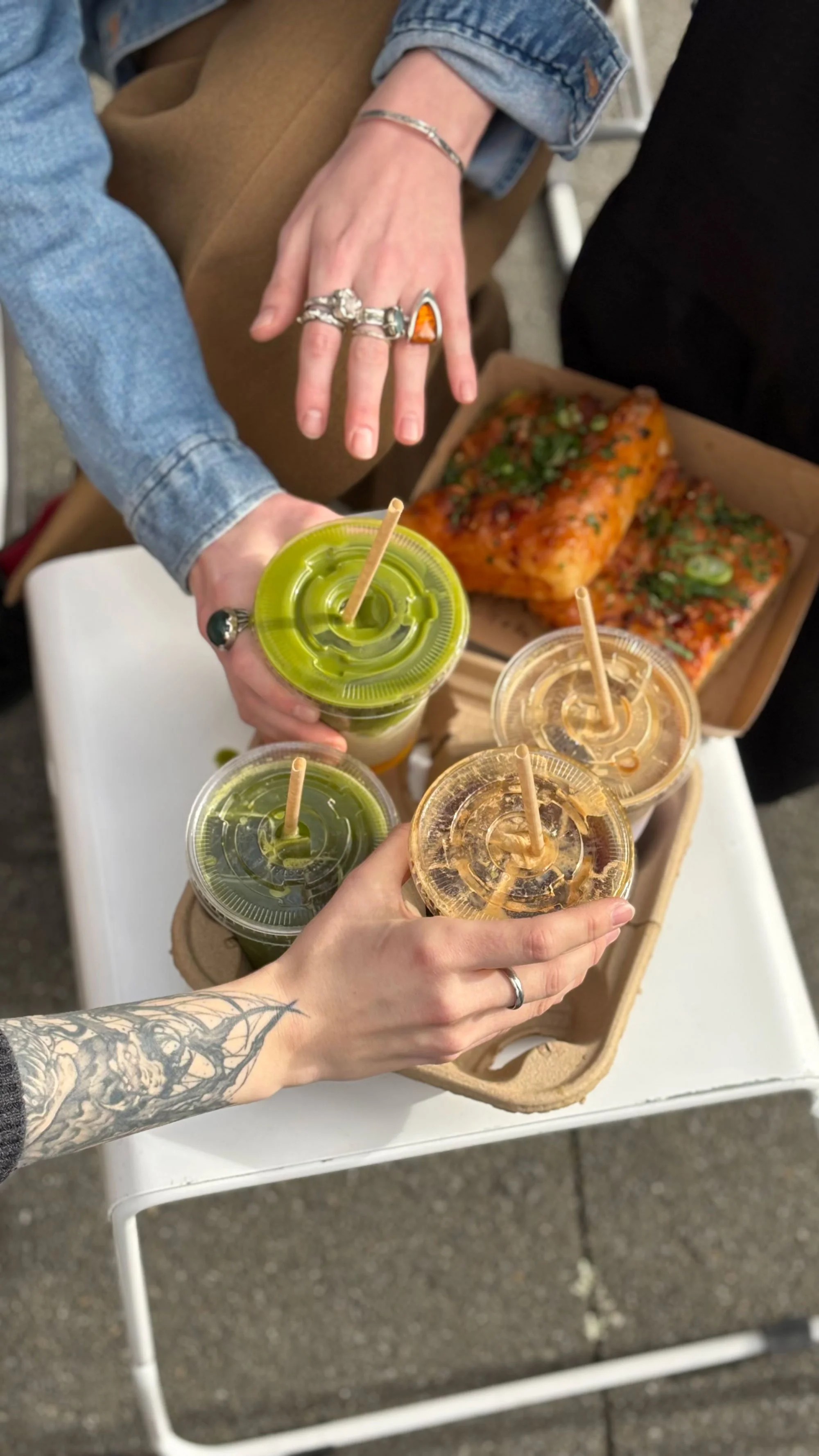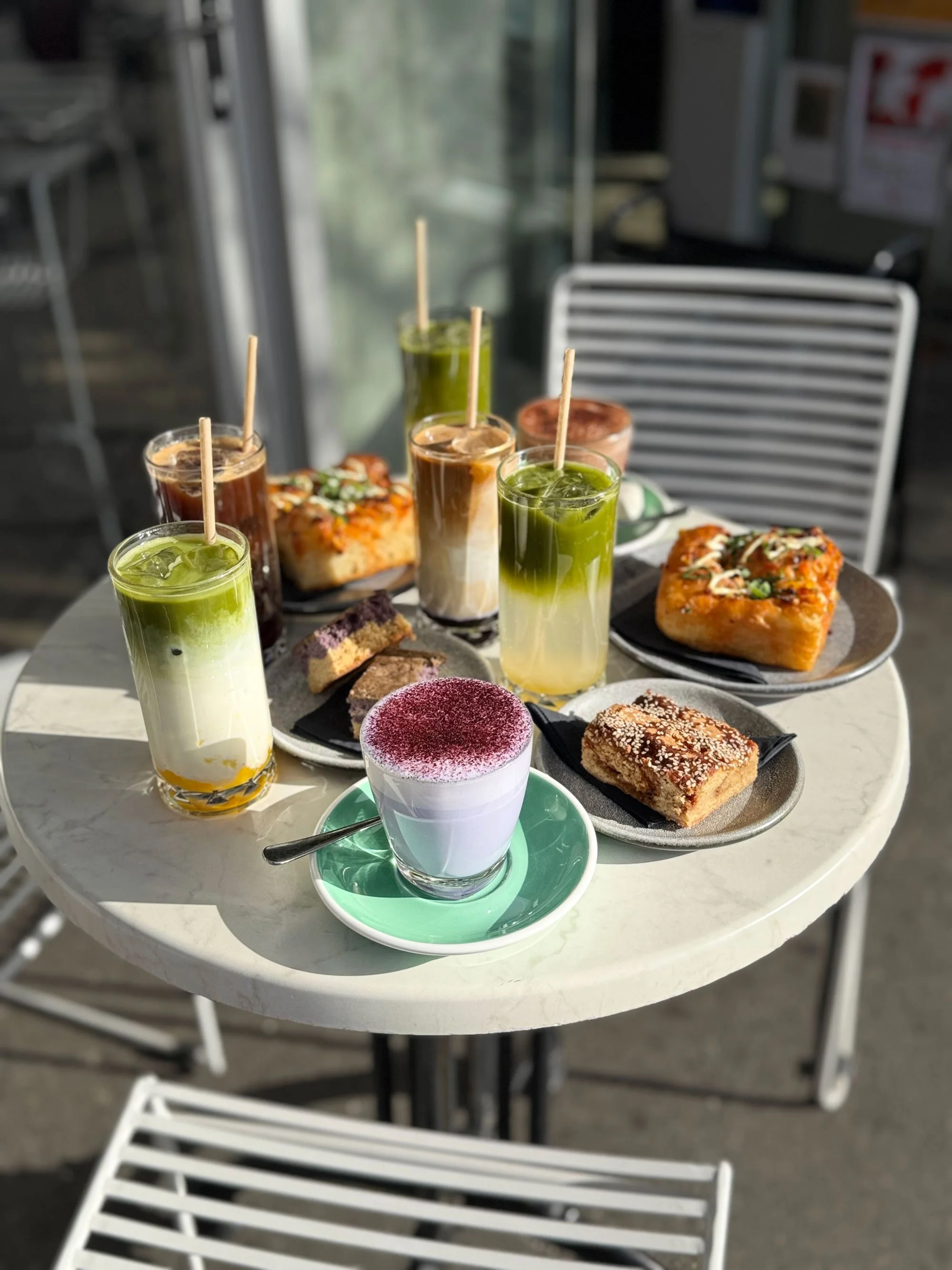People sitting outside Lunch Money, Wellington's best, most iconic cafe, drinking a variety of coffee drinks - iced ube latte, iced matcha latte, iced latte and eating our legendary hot
