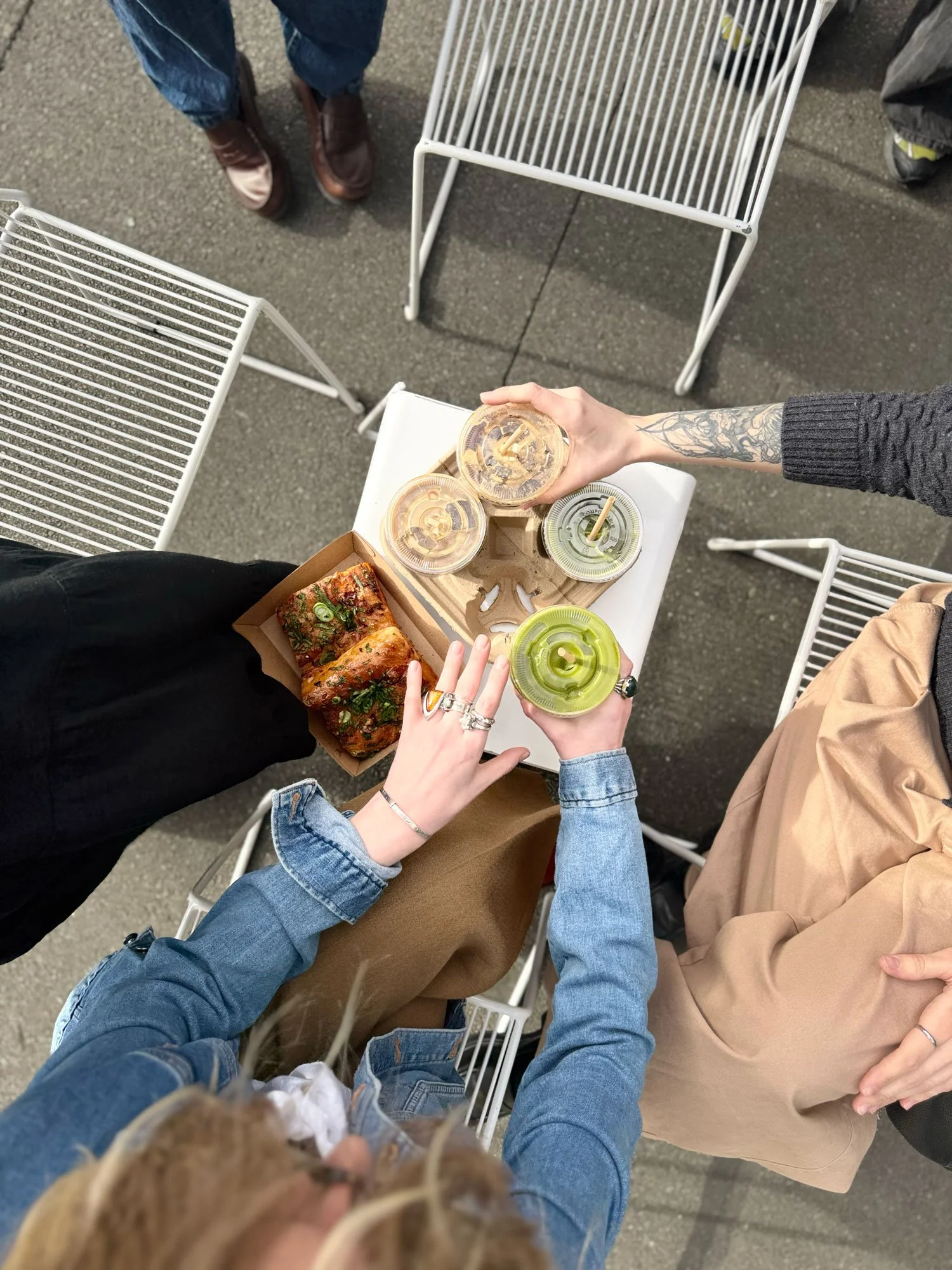 Top-down view of three people holding drinks with green lids and straws, sharing a tray of food on a small white table surrounded by white chairs outdoors.